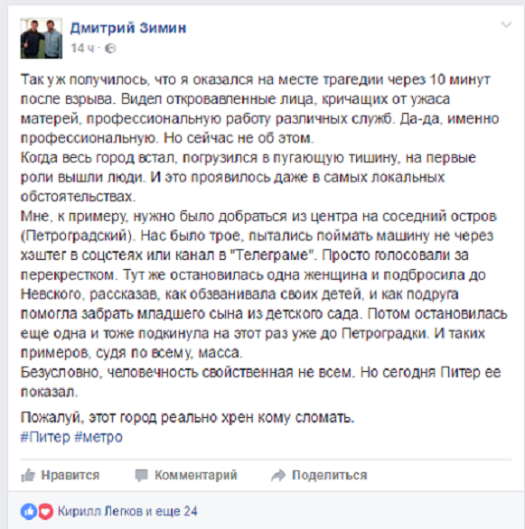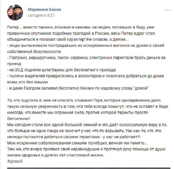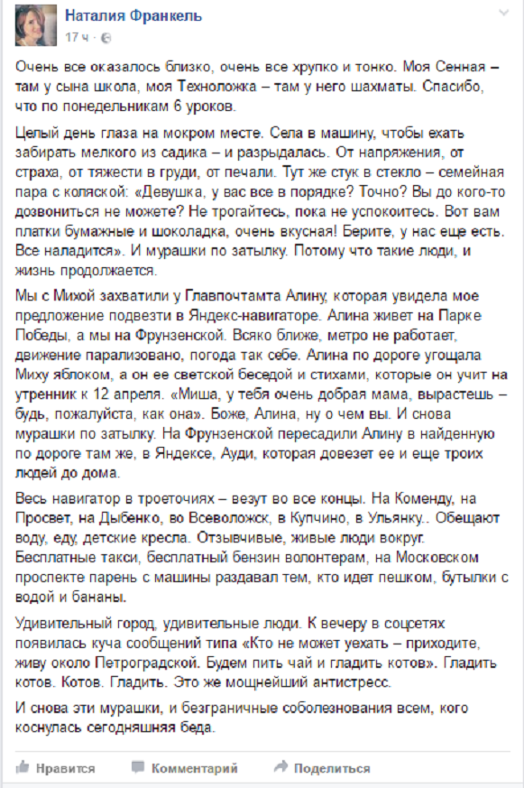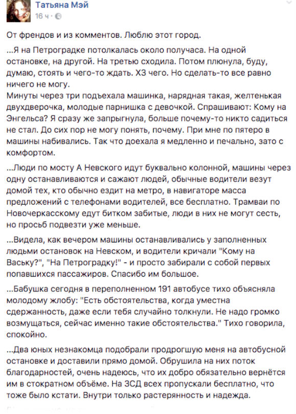 «Росбалт Like» собрал несколько реплик и постов из соцсетей без всяких дополнительных пояснений и комментариев. Просто иллюстрации того, как в Петербурге беда проявила в людях лучшее, что в них есть, и многим вернула веру в человечество.
