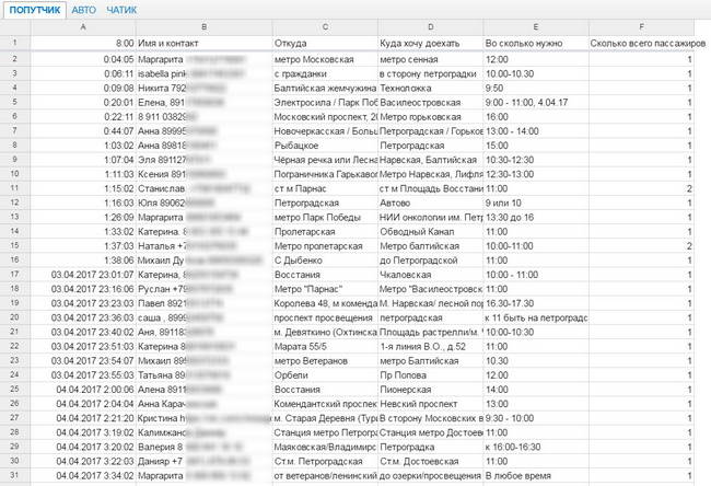 Табличка в Google Таблицах со списком автомобилистов, готовых бесплатно подвезти петербуржцев.